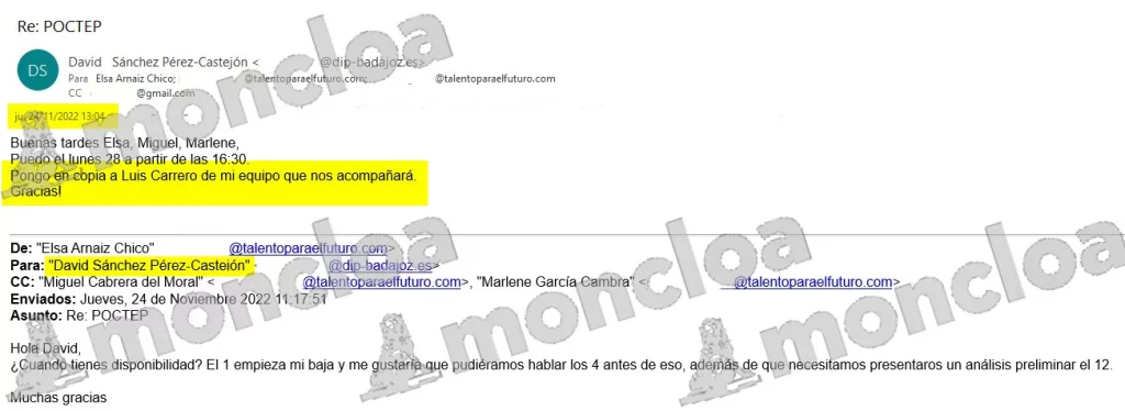 Hasta 50 mails probaría la existencia de una relación «laboral» previa a su contratación por la Diputación de Badajoz entre el funcionario Luis Carrero Pérez y David Sánchez Pérez-Castejón, hermano del presidente del Gobierno previos a la contratación del primero por la Diputación de Badajoz. Mientras Carrero prestaba servicio en Presidencia del Gobierno y Sánchez en la Diputación de Badajoz, éste último mandaba correos para, por ejemplo, negociar un programa donde decía que «pongo en copia a Luis Carrero de mi equipo que nos acompañará».