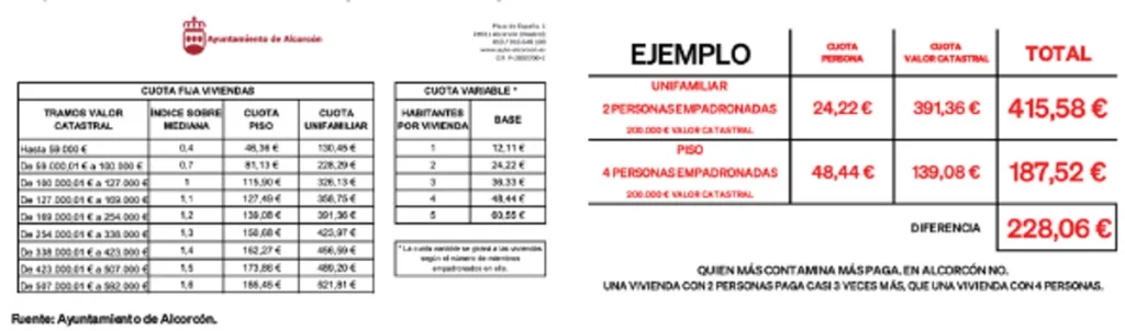 El Gobierno municipal de Alcorcón, con Candelaria Testa al frente, no escatima en razonamientos ‘progues’ para justificar este ‘basurazo. No obstante, a pesar de que la premisa es: «Quien más contamina, más paga», en el municipio no se aplica, sino que castiga a quienes habiten en viviendas unifamiliares. Además, tampoco discierne entre residuos, como pueden ser los de una pescadería y una papelería, pegando un hachazo por igual al papel que a restos orgánicos.