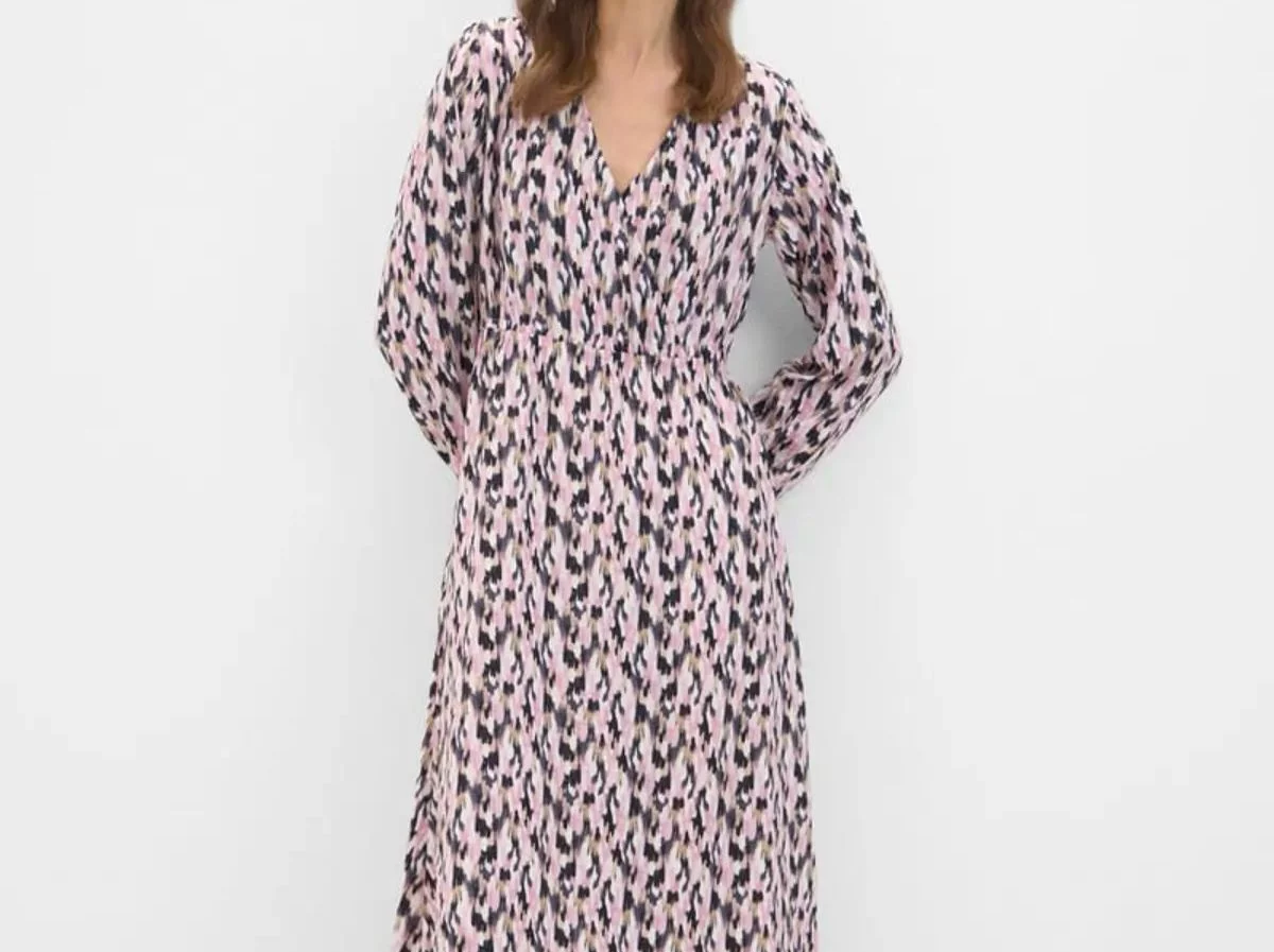 Este vestido es uno de los más favorecedores de la colección de Cortefiel, ya que aunque es bastante holgado en general, el corte en la cintura hace realzar la figura. El estampado es muy sutil pero al mismo tiempo llamativo por su originalidad y su diseño fluido es el aliado número uno para la comodidad. Esta prenda, sin duda, tiene el balance perfecto entre sofisticación y frescura, una combinación que muchas mujeres aman.