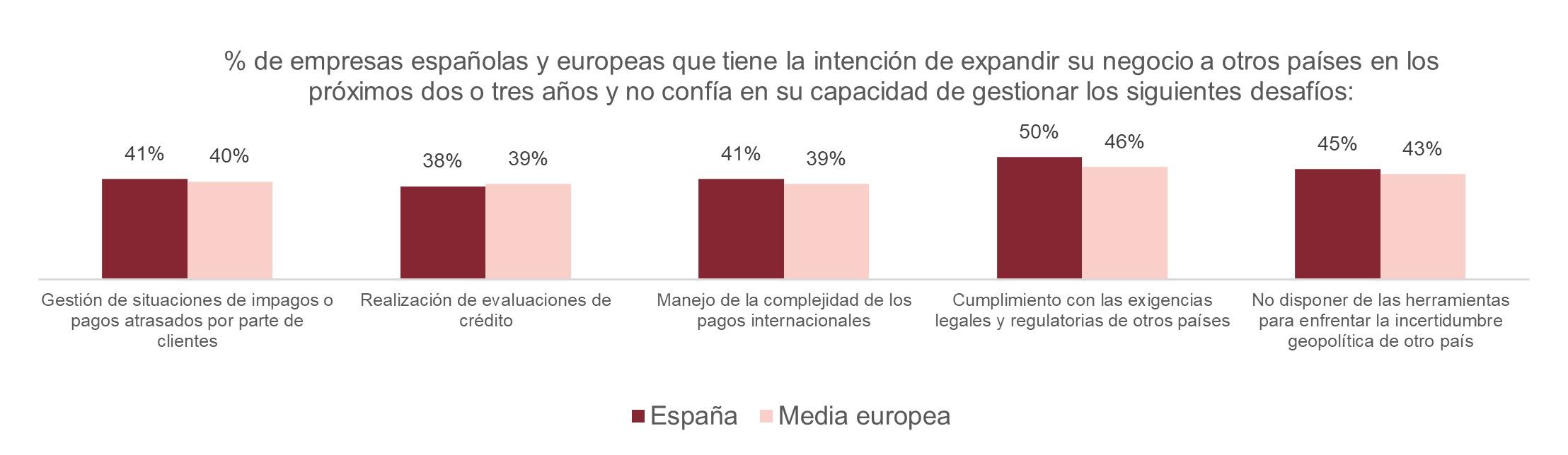 Dentro de este grupo de compañías que buscan internacionalizarse, el 41% no confía en su capacidad para gestionar correctamente en otros mercados situaciones de impagos o pagos atrasados por parte de clientes. Una inquietud compartida a nivel europeo, donde el 40% de las organizaciones con deseo de dar el salto fuera de su país, está de acuerdo con esta afirmación.
