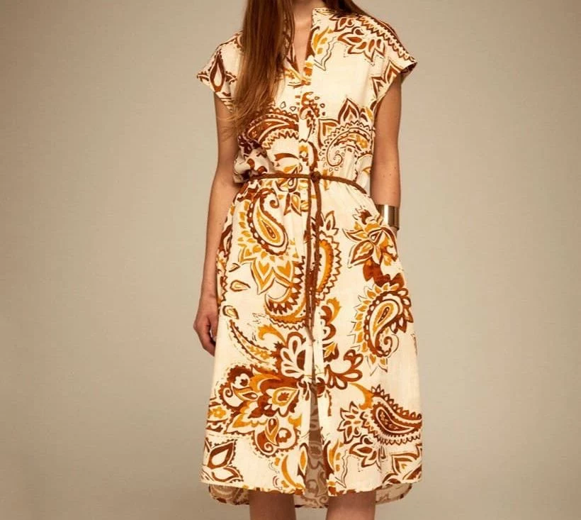 Para una opción más bohemia, Sfera tiene su vestido estampado con cinturón, una pieza que equilibra ese enfoque desenfadado de la moda con algunos toques especiales y detalles que resaltan. Este modelo tiene mangas cortas, cuello redondo y cierre frontal de botones, pero encanta por su corte recto con un cinturón de cordón a juego que te permite variar la forma como desees.