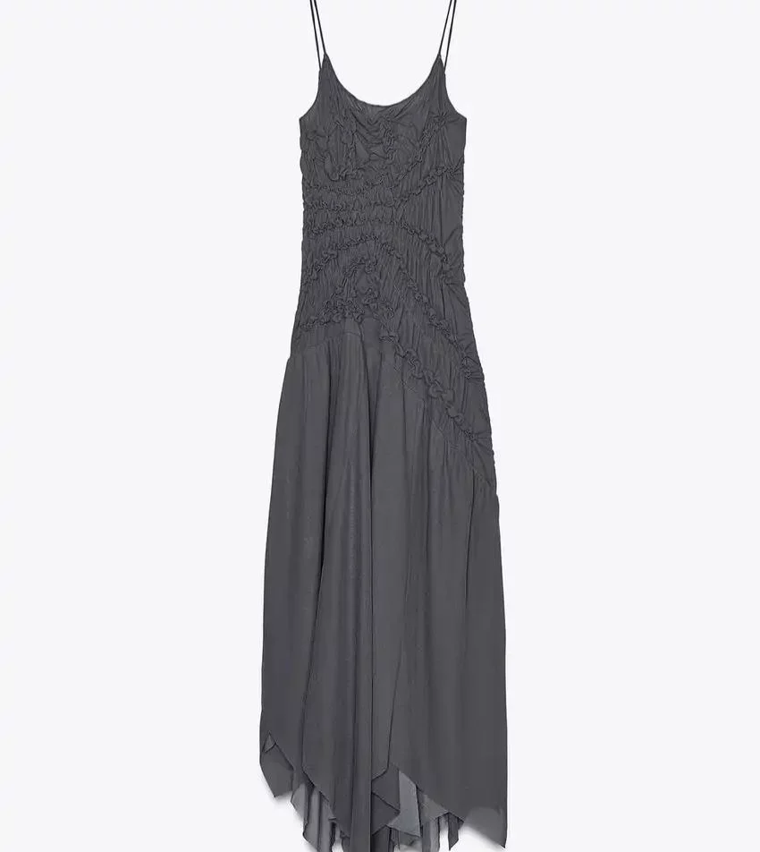 Zara se inspira en la estética noventera para ofrecer uno de los diseños más evocadores de la temporada. Su vestido de fiesta de inspiración años 90, con caída fluida y bajo asimétrico, es un homenaje al minimalismo icónico que marcó a toda una generación. Esta pieza, que recuerda al estilo inconfundible de Carrie Bradshaw, ofrece un equilibrio perfecto entre sencillez y sofisticación. Su tejido ligero y el corte relajado permiten un movimiento natural, ideal para eventos donde se busca comodidad sin sacrificar estilo. Por tan solo 29,95 euros, se convierte en una opción asequible y llena de nostalgia.
