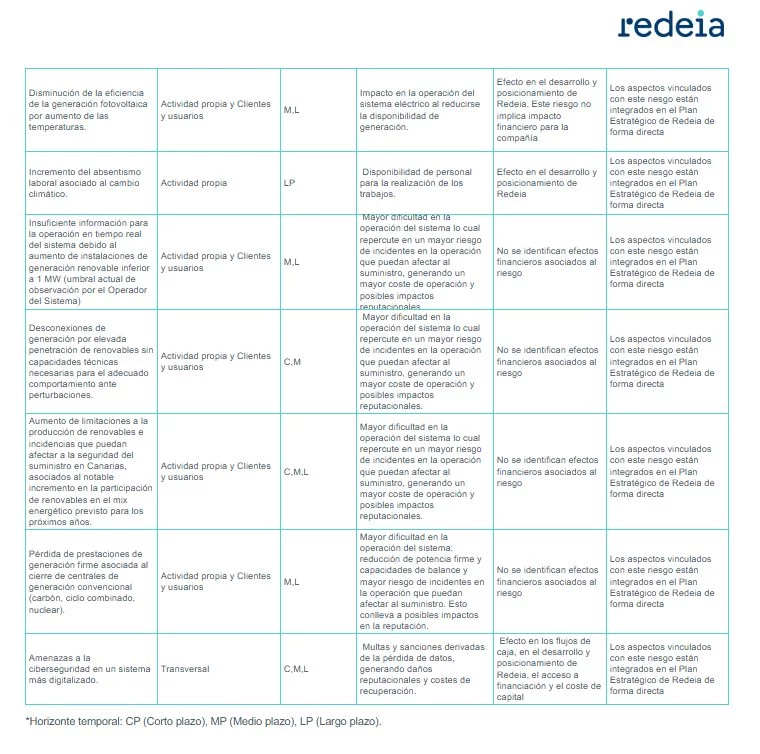 El tercer riesgo evaluado entre los catorce que se enumeran relativos al apagón eran los «daños en equipos de la red de transporte que se encuentran a la intemperie por elevada temperatura». Aquí EY es claro al explicar que «este riesgo afecta a la actividad propia de Redeia y tiene un horizonte temporal a largo plazo. Los efectos potenciales más relevantes serían el aumento de costes asociados a reparaciones y renovaciones, aumento de inversiones de capital para renovaciones en el caso de colapso de los equipos, aumento del coste de instalación de equipos nuevos en el caso de tener que modificar sus especificaciones técnicas y una eventual afección al suministro eléctrico en casos muy extremos».
