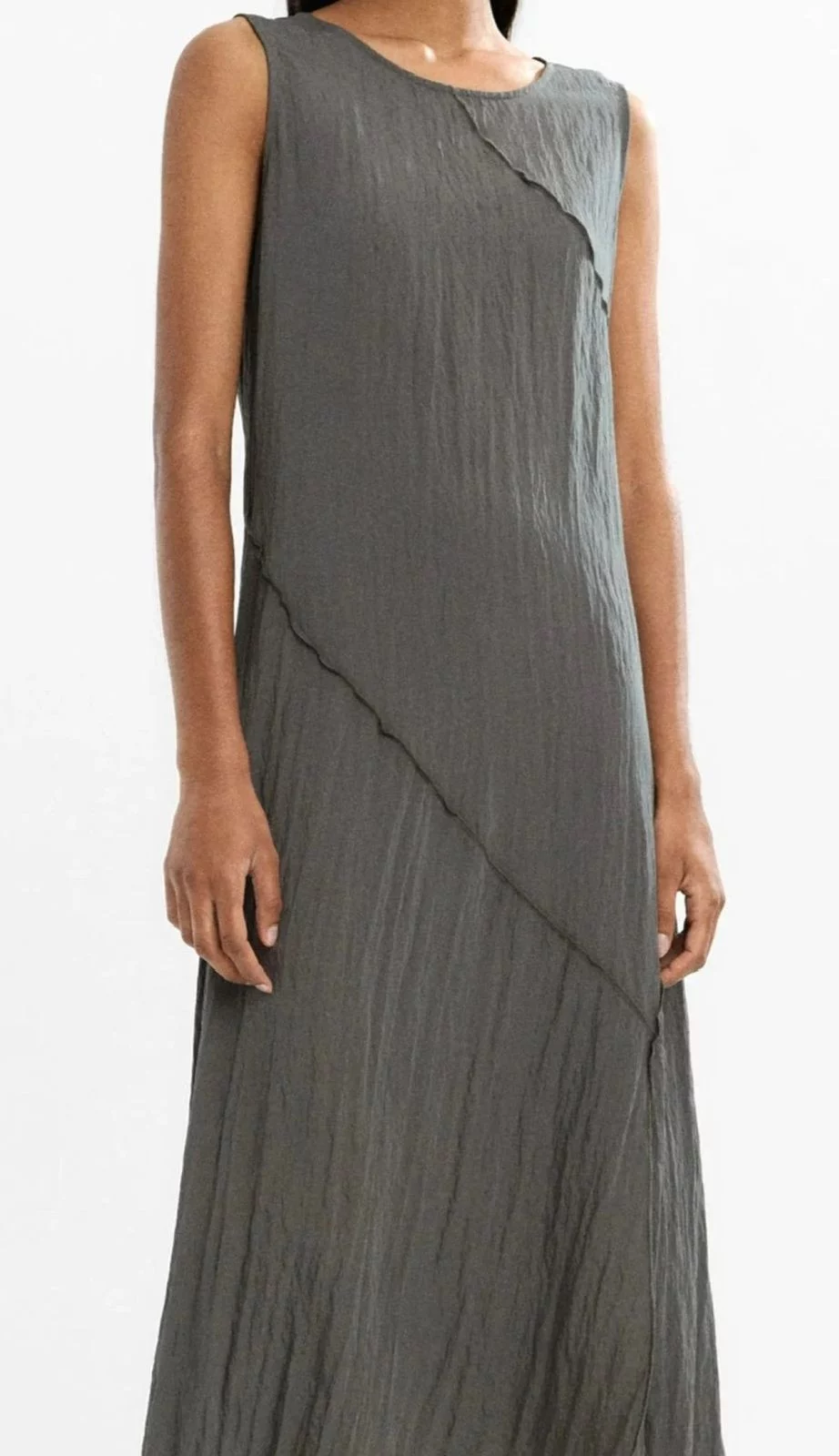 Para quienes prefieren un look más relajado y versátil, la marca presenta el vestido midi con efecto arrugado. Esta prenda destaca por su textura creada a base de pespuntes diagonales, aportando una estética única que recuerda a los plisados modernos. Sin mangas, con cuello redondo y una abertura inferior, el diseño está pensado para favorecer la silueta sin perder comodidad. El detalle del bajo trasero en punta le añade un toque diferencial muy sutil.