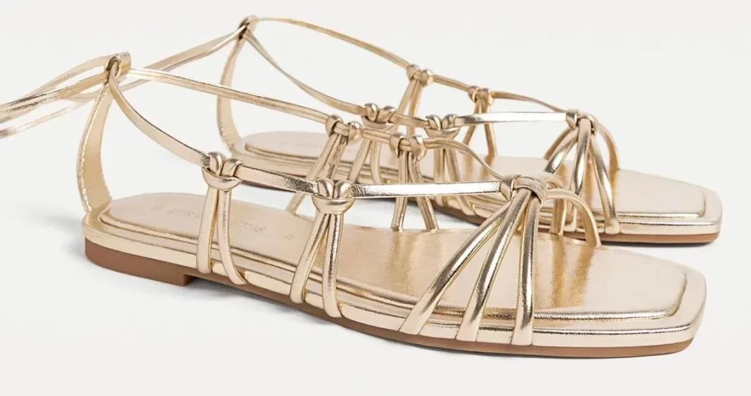Stradivarius también propone otra alternativa igual de cómoda, pero con un toque mucho más llamativo. Sus sandalias planas con tiras en color oro son una auténtica declaración de intenciones. Brillantes, ligeras y muy femeninas, están pensadas para destacar en cualquier situación, ya sea en una comida informal o en una fiesta al atardecer. Es un modelo que convierte cualquier look sencillo en algo especial con muy poco esfuerzo.