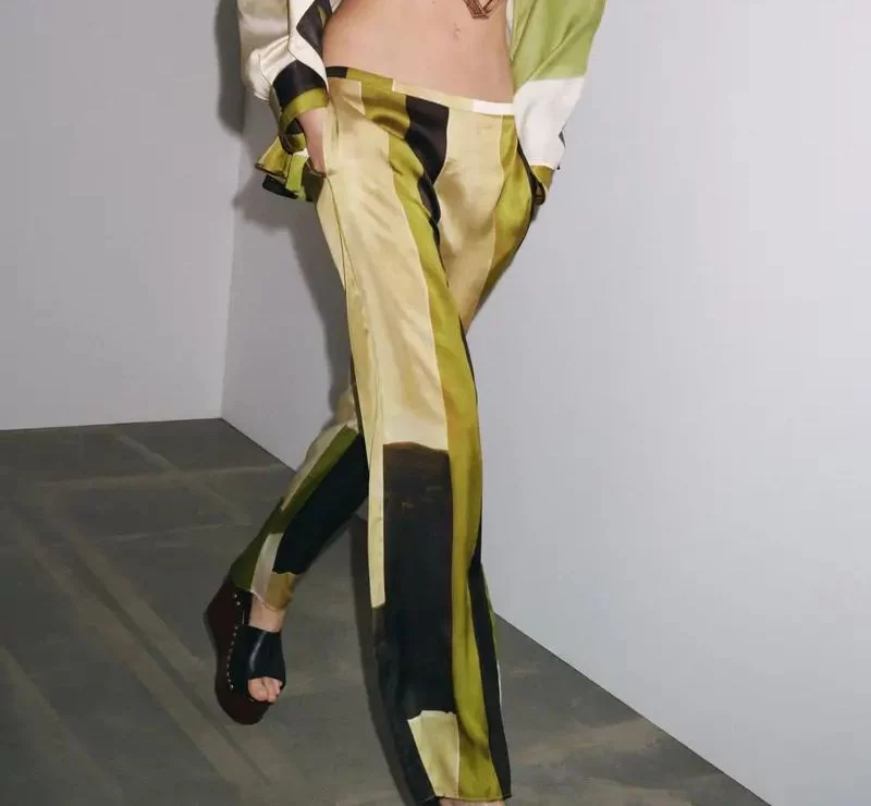 Una de las apuestas más llamativas de la colección es el pantalón estampado satinado, que cuesta 35,95 euros, con un diseño geométrico y una paleta cromática vibrante que no pasa desapercibida. Su tejido suave y su caída perfecta lo hacen tan versátil como cómodo. Puede llevarse con deportivas para un outfit de día relajado o con sandalias de tacón para una cena primaveral con aires sofisticados. Es la prueba de que el confort no está reñido con el glamour.