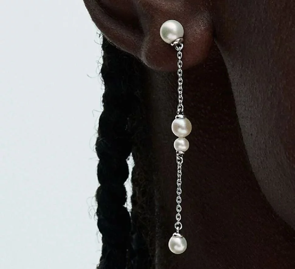 Para las amantes del estilo clásico y atemporal, Pandora propone los pendientes gota con perlas cultivadas de agua dulce tratadas en plata de primera ley. Este diseño sutil presenta una fina cadena de la que cuelgan perlas en diferentes tamaños, creando un efecto cascada que aporta movimiento y delicadeza. Perfectos para quienes prefieren joyas discretas pero con presencia, estos pendientes combinan con todo tipo de peinados y vestidos.
