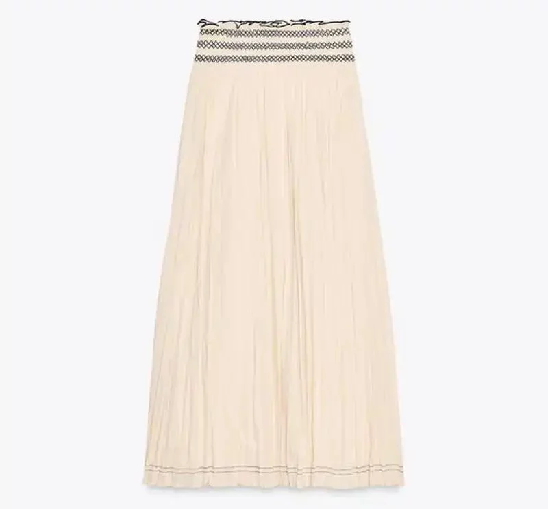 Zara ha logrado transformar una silueta sencilla en una joya del armario veraniego con su falda rústica en marfil y cintura a contraste. Con un precio de 35,95 euros, esta prenda nos transporta directamente a un atardecer en el Egeo, con sus pespuntes artesanales y su tejido arrugado que no necesita plancha ni disculpas. Su diseño de tiro alto y nido de abeja favorece sin marcar, y el forro interior es un detalle práctico que no siempre se encuentra en prendas de este tipo.