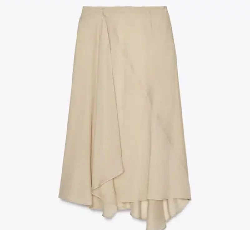 Otra de las joyas que Zara ha incluido esta temporada es su falda fluida semitransparente en tono arena, por 29,95 euros. Esta prenda logra un equilibrio sutil entre la sensualidad y el confort, gracias a su tejido ligero y su bajo asimétrico. La transparencia está estratégicamente pensada para sugerir sin enseñar demasiado, y convierte cualquier paseo veraniego en una escena de película.