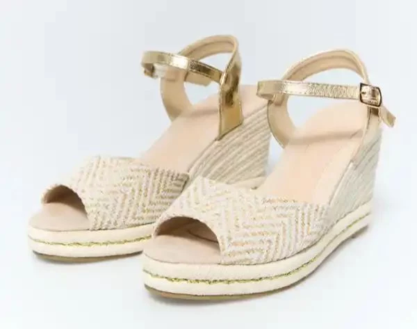 Entre los modelos estrella de esta temporada, las alpargatas de rafia de Sfera destacan por su capacidad de conjugar el encanto artesanal con un aire sofisticado. El tejido natural de rafia se viste de gala con detalles en color oro, que aportan un toque de lujo sutil y moderno. Este modelo no solo es cómodo gracias a su cuña equilibrada, sino que además estiliza y eleva cualquier conjunto.