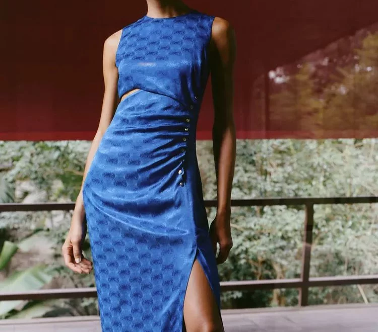 Zara propone el vestido midi jacquard en color azul, un diseño que está arrasando en las tiendas. Con cuello redondo, manga sisa y detalles que marcan la diferencia como la abertura lateral en la cintura y los falsos botones decorativos, este vestido destaca por su silueta pulida y contemporánea. El bajo con abertura frontal añade movimiento y frescura al caminar, y el cierre de cremallera oculta en la espalda garantiza un acabado limpio y sin interrupciones visuales.