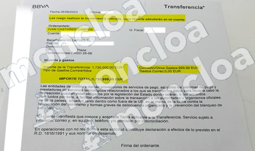 Castañer aportó después 46 facturas de transferencias desde la empresa Skyward Tech hacia Villafuel por un valor aproximado de 36.600.000 euros, todas ellas realizadas entre junio y julio de 2023. Este ex administrador de la sociedad en Barcelona explicó que «fui captado por Santiago Cirera, me ofreció un dinero que nunca cobré y sólo tenía que hacer transferencias cuando me lo dijera. Me compraron un traje, fui al notario y tenía que trabajar de 8 de la mañana a 2 de la tarde, de lunes a viernes. Luego fui a abrir una cuenta bancaria con Cirera y nos costó mucho hasta que abrimos una en Gavá, donde vivía él».