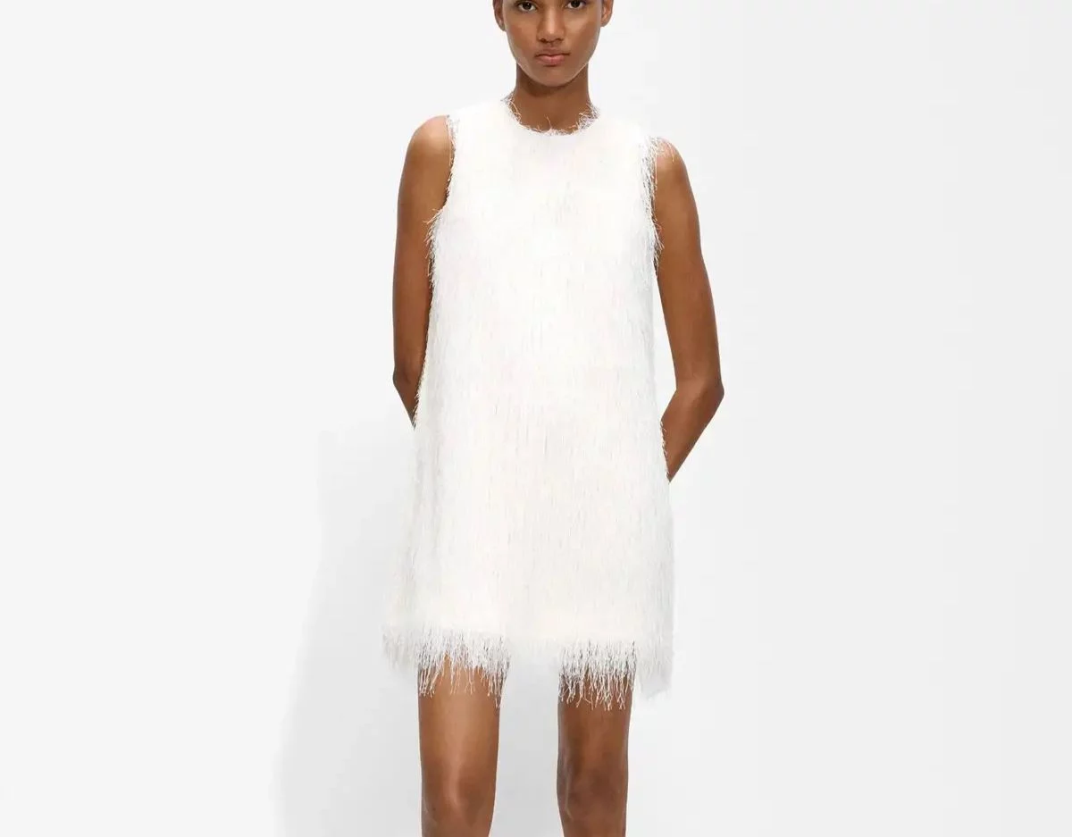 Si hay algo que define este modelo de Parfois es su estética naíf con toques setenteros. El vestido babydoll con detalles de plumas en el bajo es perfecto para aquellas novias que quieren divertirse y destacar sin complicarse. Su corte amplio favorece a todas las siluetas, y su aire retro lo convierte en un modelo único dentro de la colección. Es fácil imaginarlo acompañado de cuñas de esparto y un peinado con mechones sueltos, perfecto para una noche de verano desenfadada pero especial.