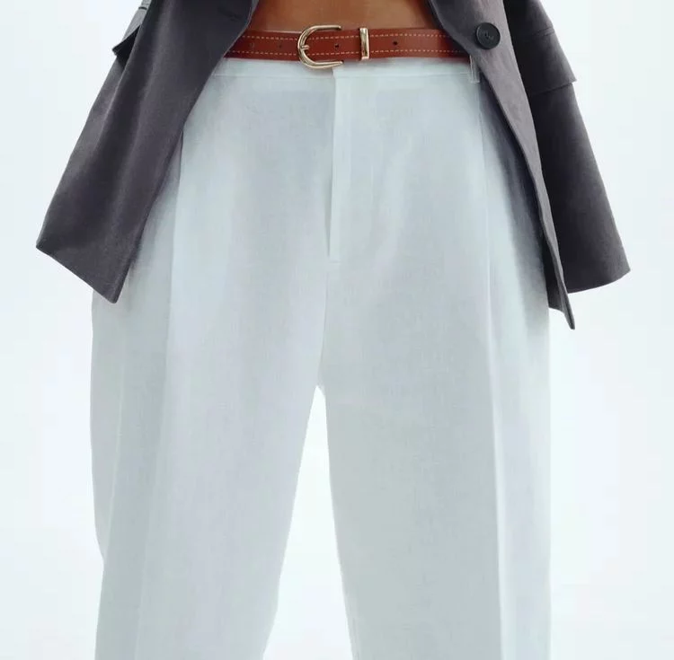 Zara no ha olvidado a las amantes del corte clásico. Su pantalón blanco recto con cinturón está confeccionado en lino, uno de los tejidos más deseados para el verano por su ligereza y transpirabilidad. De tiro alto y con pinzas delanteras, este diseño favorece a todo tipo de siluetas. El detalle del cinturón integrado y los bolsillos frontales, además de los falsos bolsillos con solapa en la espalda, aportan un toque estructurado y elegante.