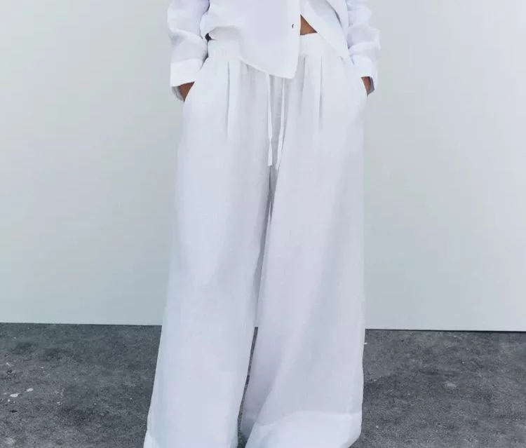 Para quienes buscan una opción cien por cien natural, la marca ofrece su pantalón palazzo confeccionado íntegramente en lino. Con un diseño de tiro medio, cintura elástica y pierna ancha, este modelo encarna el espíritu del verano. El lino aporta frescura y textura, mientras que el corte palazzo permite una caída fluida que acompaña cada paso con elegancia. El color blanco roto, nuevamente protagonista, suaviza el look y lo hace más versátil.