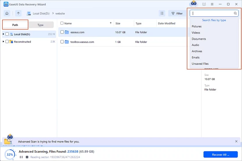 Comience con un análisis simple para encontrar los archivos eliminados o seleccione el análisis completo si prefiere una recuperación completa. Después del análisis, haga clic en «Filtrar» para filtrar rápidamente por tipo, tamaño o fecha de creación. También puede usar el cuadro de búsqueda para buscar archivos específicos por su nombre.