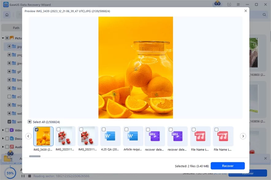 Previsualice los archivos recuperados para asegurarse de que sean los deseados. Una vez comprobado el orden de los archivos, haga clic en «Recuperar» y elija un destino seguro donde desee recuperar sus datos.