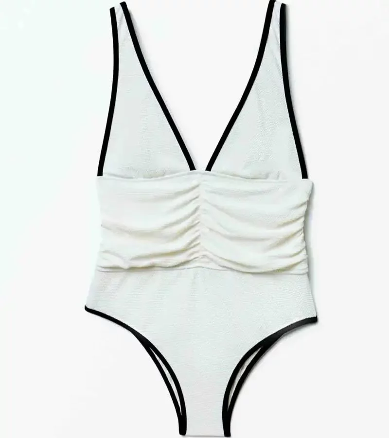 También en la moda de baño, el blanco y negro se consolidan como una apuesta segura. Este bañador, con base blanca y ribetes negros en contraste, es la definición de elegancia atemporal. Lo que más destaca de este diseño es su escote en uve pronunciado y los frunces centrales, perfectos para afinar visualmente la silueta y disimular la zona del abdomen. Una elección inteligente para quienes buscan estilizar sin renunciar al estilo.