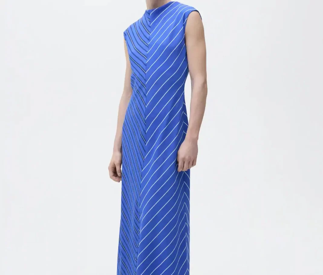 Uno de los favoritos de la temporada es el vestido largo de rayas azules. Con un diseño evasé y sin mangas, este modelo destaca por su cuello drapeado y su cierre de botones en la parte posterior, lo que le aporta un toque sofisticado sin renunciar a la comodidad. Es perfecto para los días calurosos en los que quieres sentirte ligera y bien vestida al mismo tiempo. Además, está disponible en tallas Plus, lo que lo convierte en una opción inclusiva y estilosa para muchas siluetas.