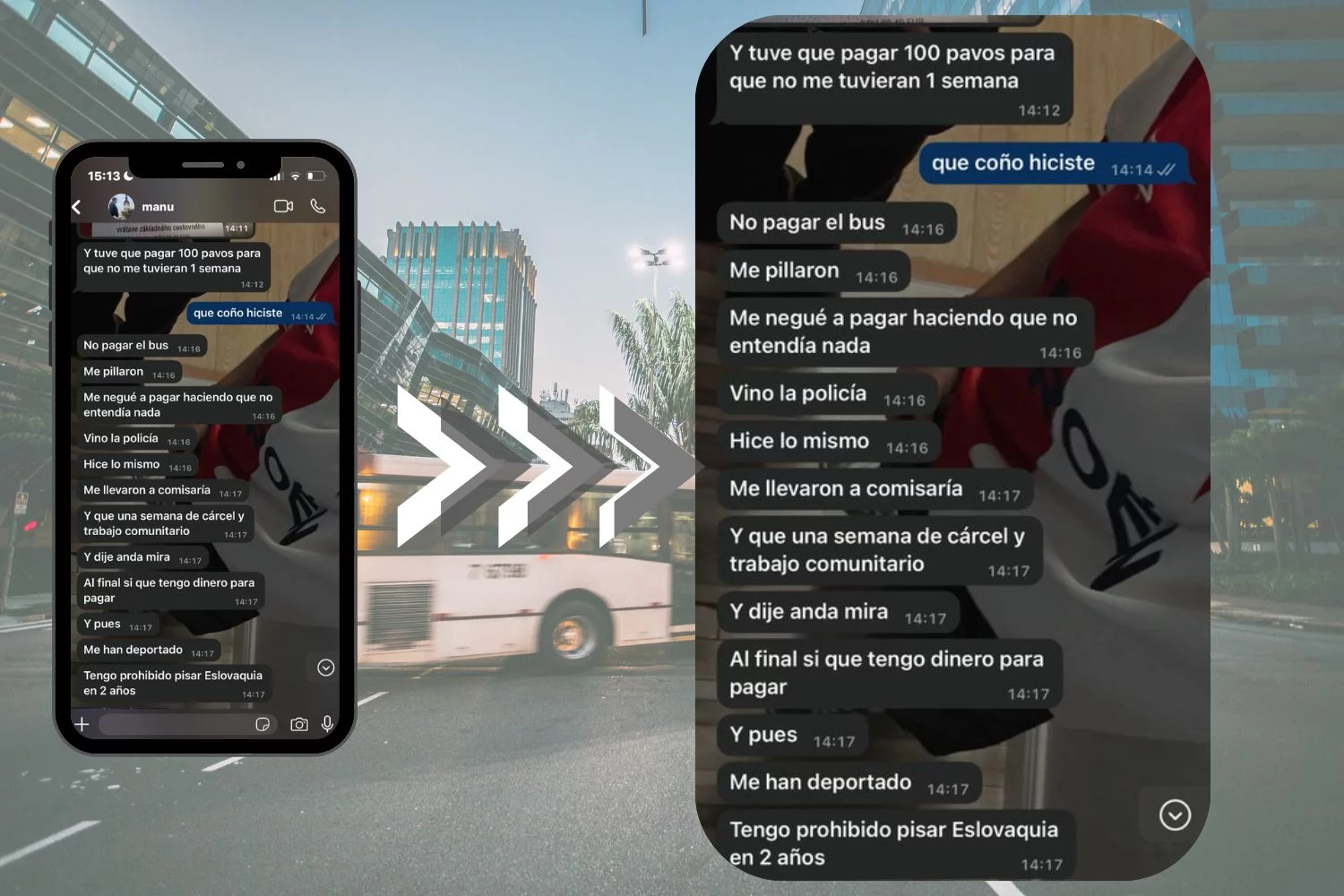 Esta situación que se hizo viral en redes sociales, comienza con la imagen de una conversación de WhatsApp. Resulta que un usuario en X (antes Twitter) compartió el chat con su amigo «Manu», quien le confesó su odisea en Eslovaquia. Y es que si viajas a un país y desconoces sus leyes o te quieres hacer el espabilado, te puede pasar lo siguiente. Resulta que «Manu» ideó una estrategia para librarse de pagar el billete del bus.
