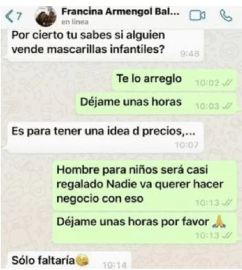 Es decir, para los querellantes Armengol y Aldama no solo se conocerían «sino que la conversación versaba sobre la compra de mascarillas en el contexto de la pandemia, elemento claramente relacionado con el objeto de la investigación de la Comisión del Senado. Se aporta como documento nº 7 artículo periodístico en el que constan capturas de esta conversación, capturas aportadas por el propio Sr. Aldama, interviniente en la misma, a través de su portavoz, el Sr. Ramón Bermejo, y mostrándose las mismas por primera vez durante el programa “Horizonte” (19 de diciembre de 2024)».