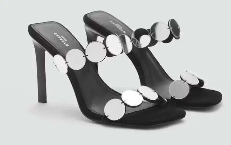 Si hay un diseño de la colección de Mango que se roba todas las miradas, es el de las sandalias con detalle de espejos. Confeccionadas en piel y decoradas con aplicaciones metálicas circulares, estas sandalias parecen una joya arquitectónica. Recuerdan a una bola de espejos reinterpretada en clave sofisticada y moderna. El tacón alto y fino aporta altura y presencia, mientras que la forma tipo mule asegura sujeción y comodidad en cada paso.