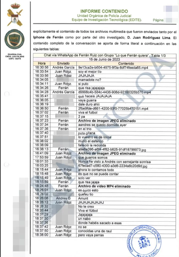 La Guardia Civil no tuvo reparos en transcribir literalmente los calificativos empleados por los integrantes del chat: «una guarra» y «puta gitana». Entre los comentarios la UCO destaca los comentarios de Juan Rodríguez, «que llega a afirmar «ahora lo contamos todo» y «es que no se puede contar». El hilo completo de la conversación recuperada del iPhone de Ferrán se extiende hasta las 14:44 del 18/06/2023, en ese espacio temporal se comenta explícitamente el contenido de todos los archivos multimedia que fueron enviados tanto por el iPhone de Ferrán como por parte del otro investigado, Juan Rodríguez Lima».