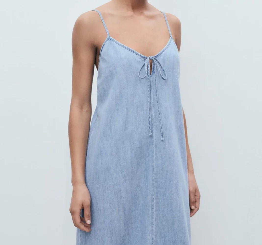 Mango propone un vestido vaquero de tirantes que redefine lo que entendemos por una prenda fresca y sofisticada. Confeccionado en una mezcla de algodón y lino, este diseño logra un equilibrio perfecto entre la frescura de los materiales y el estilo del tejido denim. Su corte largo y recto, unido a los tirantes finos ajustables y al detalle de lazo en el escote, lo convierten en una pieza cómoda, versátil y muy favorecedora.