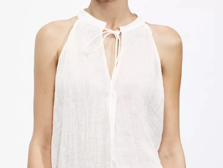 Otra de las joyas de estas rebajas es el top blanco confeccionado en 100% lino, uno de los tejidos estrella del verano por su frescura y transpirabilidad. Este diseño presenta cuello halter y hombros descubiertos, ideal para los días más calurosos. El detalle de la abertura delantera ajustable con lazadas le da un toque delicado y favorecedor, mientras que el bajo asimétrico añade un aire moderno y desenfadado. Su precio también ha bajado hasta 17,99 euros, haciéndolo uno de los más deseados de la temporada.