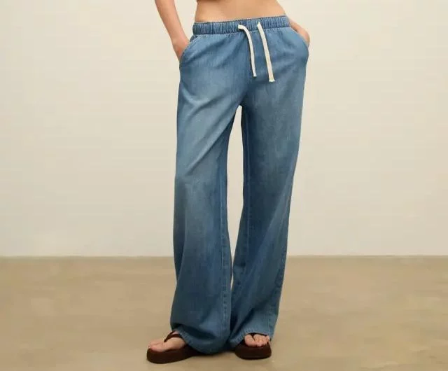 Para las amantes del denim que no quieren pasar calor en verano, Stradivarius presenta la solución ideal. Se trata de un pantalón largo fluido con apariencia vaquera, pero con todas las ventajas de un tejido ligero. Este modelo en azul medio mantiene el encanto del denim tradicional, pero gracias a su confección con tejidos más frescos y su cintura elástica con cordón, se adapta mejor a las altas temperaturas.