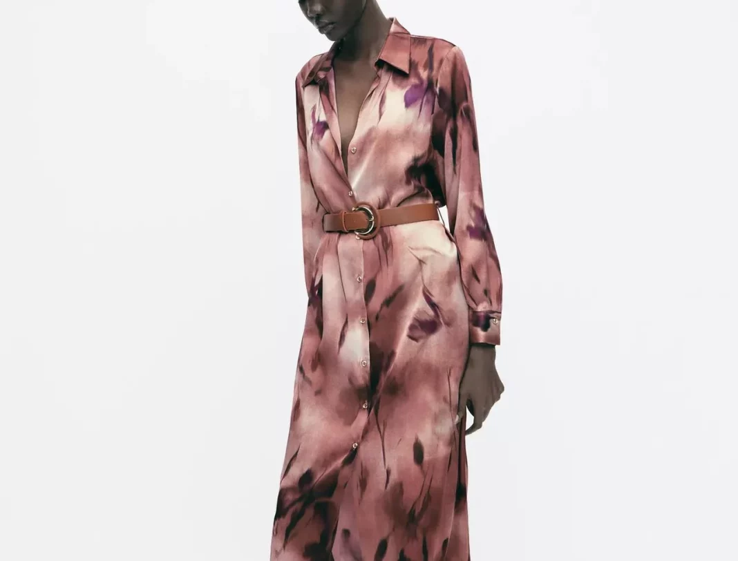 Uno de los modelos estrella de estas rebajas es el vestido midi satinado con estampado y cinturón. Este diseño, con cuello solapa, escote en pico y manga larga, logra ese equilibrio entre elegancia y ligereza que tanto buscamos en verano. El cierre frontal con botones permite ajustar la apertura al gusto, y el cinturón marca la cintura de manera sutil y favorecedora. Perfecto para una cita o un evento semiformal, ahora tiene un precio muy tentador de 29,99 euros rebajados al precio inicial de 49,95.