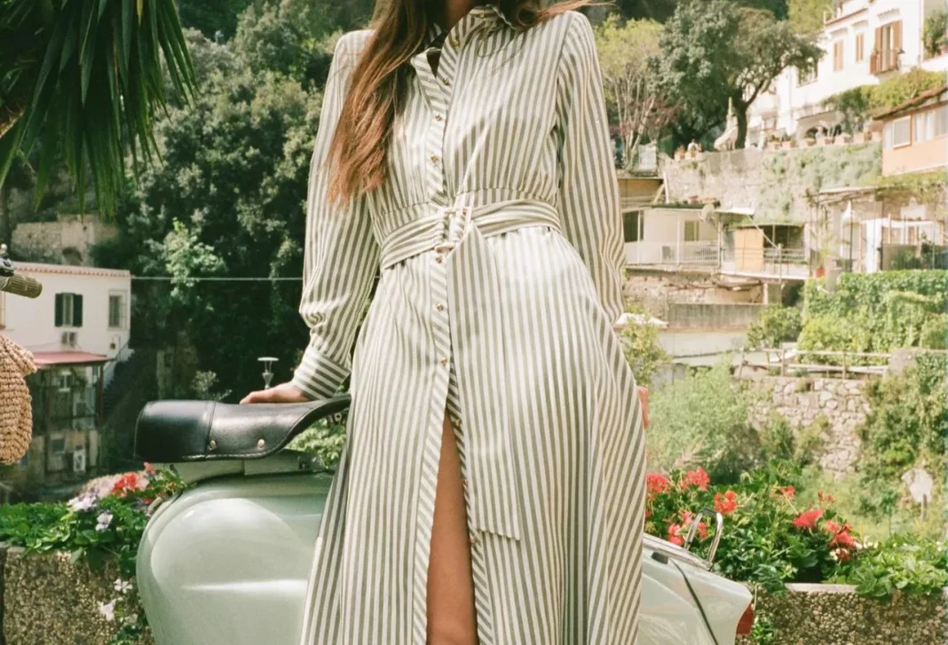 La marca ha sabido reinterpretar el estilo marinero con este diseño de rayas en verde que se aleja del típico azul navy, apostando por una paleta más suave y refrescante. Con unas simples cuñas beige o marrón claro, este vestido se transforma en el look ideal para una tarde con amigas o una salida improvisada. Su corte y diseño hacen que sea tan funcional como estiloso, y su cinturón permite adaptarlo al gusto de cada una.