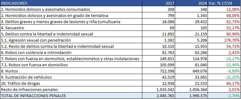 La comparativa incluso con datos oficiales no resiste el discurso, ya que, por ejemplo «los homicidios dolosos y asesinatos en grado de tentativa han aumentado un 68%. Los delitos graves y menos graves de lesiones y riña tumultuaria han crecido un 62,73%. Los secuestros se han incrementado en más del 52%. Los delitos contra la libertad e indemnidad sexual han aumentado en un preocupante 80,96%, con un pico dramático del 276,70% en el caso de las agresiones sexuales con penetración y el tráfico de drogas ha subido un 66,17%».