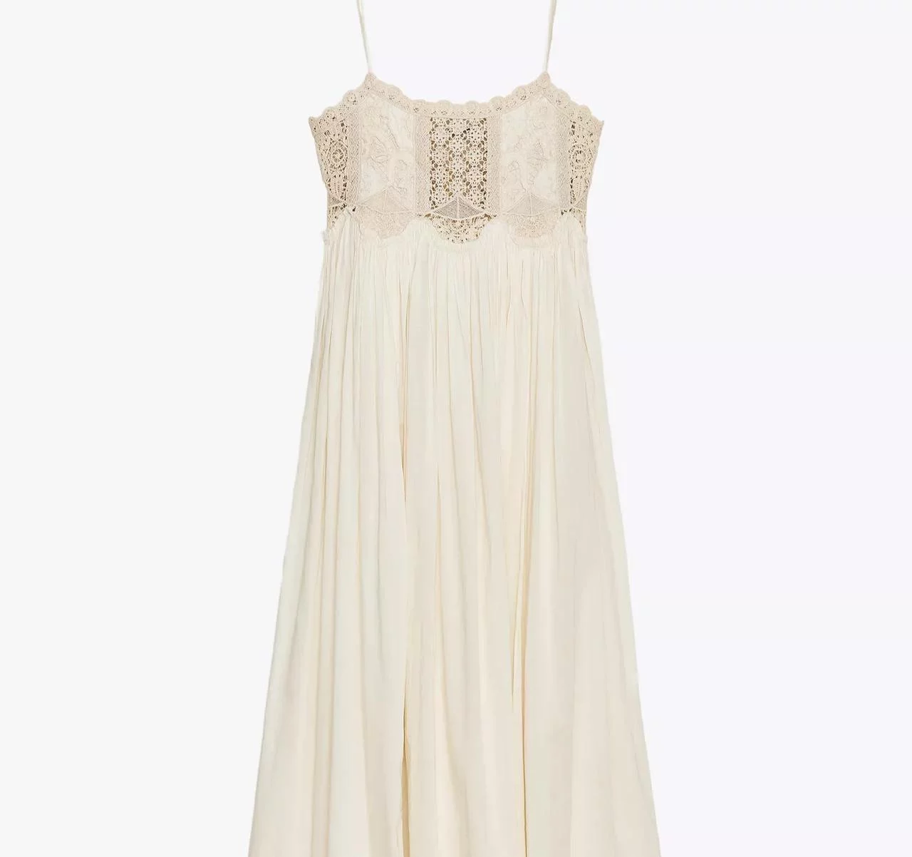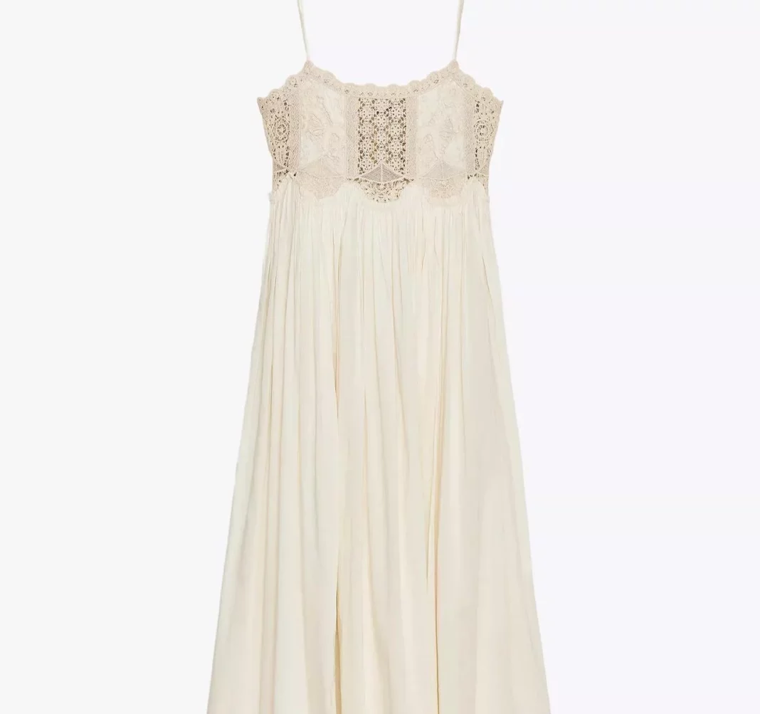Este vestido confeccionado en hilatura de algodón es, sin duda, una de las joyas de la temporada. Su escote recto y tirantes finos le dan un aire delicado y minimalista, mientras que el detalle de aplicación de crochet en color crudo lo convierte en una pieza artesanal que respira verano por cada costura. Es perfecto para combinar con unas sandalias planas y un bolso de rafia, logrando ese look relajado pero sofisticado que tanto buscamos en vacaciones.