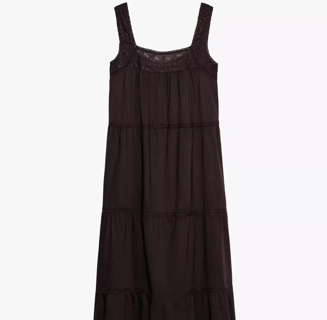 Para quienes aman los detalles delicados, este vestido en color marrón con puntilla y bordados a tono es una opción insuperable. Con escote recto y tirantes anchos, este modelo realza los hombros y ofrece una silueta estructurada pero cómoda, perfecta para estilizar la figura sin sacrificar frescura. El tono tierra, además, está en plena tendencia y combina a la perfección con complementos dorados o de materiales naturales.
