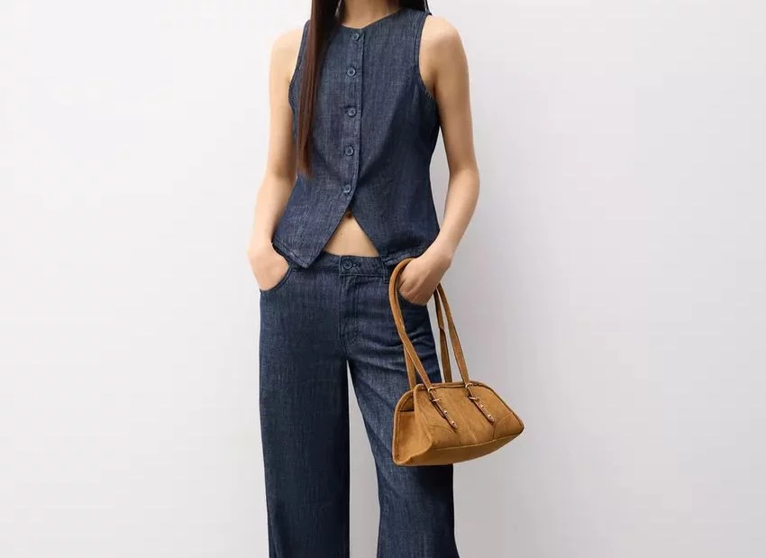 Otro de los nuevos favoritos de Lefties es el conjunto compuesto por un chaleco denim sin mangas y unos pantalones de pernera ancha. El top estilo chaleco, con cuello redondo y cierre de botones, cuesta apenas 15,99 euros y ofrece ese punto intermedio entre formal e informal que muchas buscan para el entretiempo. Además, su estructura añade definición a la parte superior del cuerpo.
