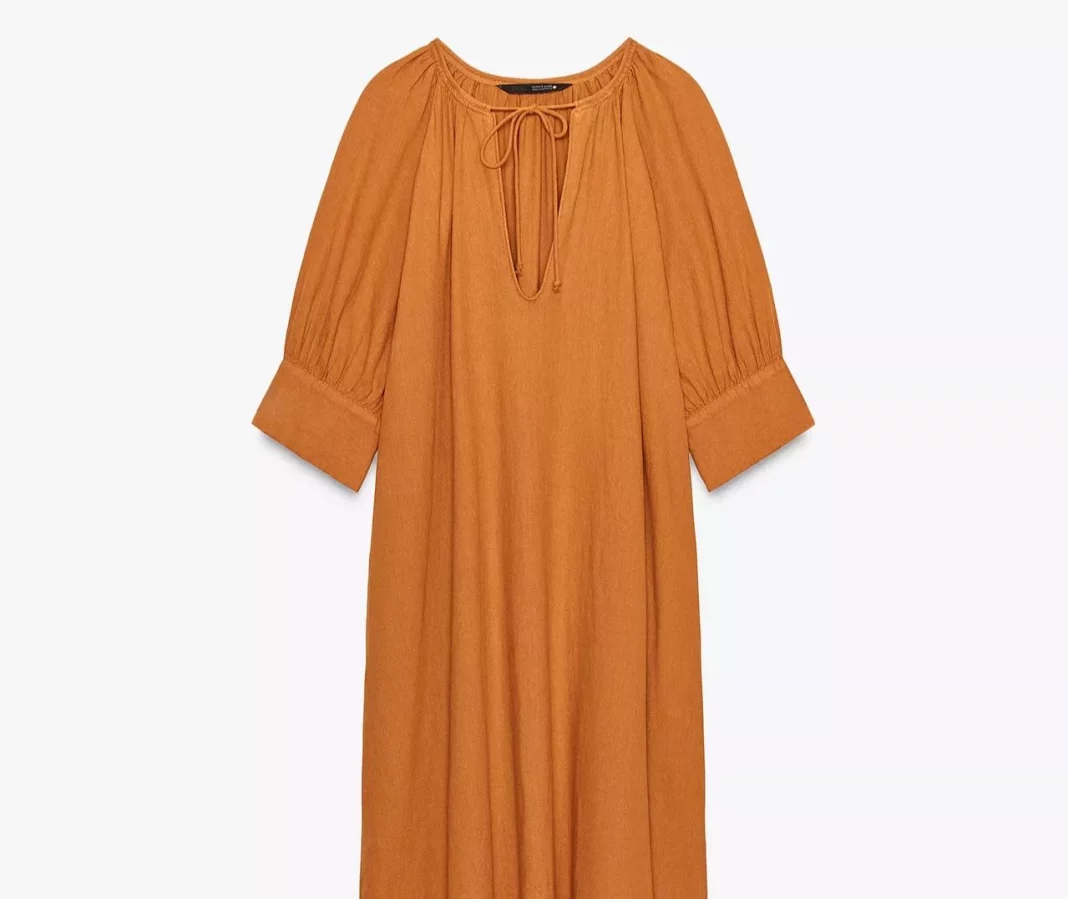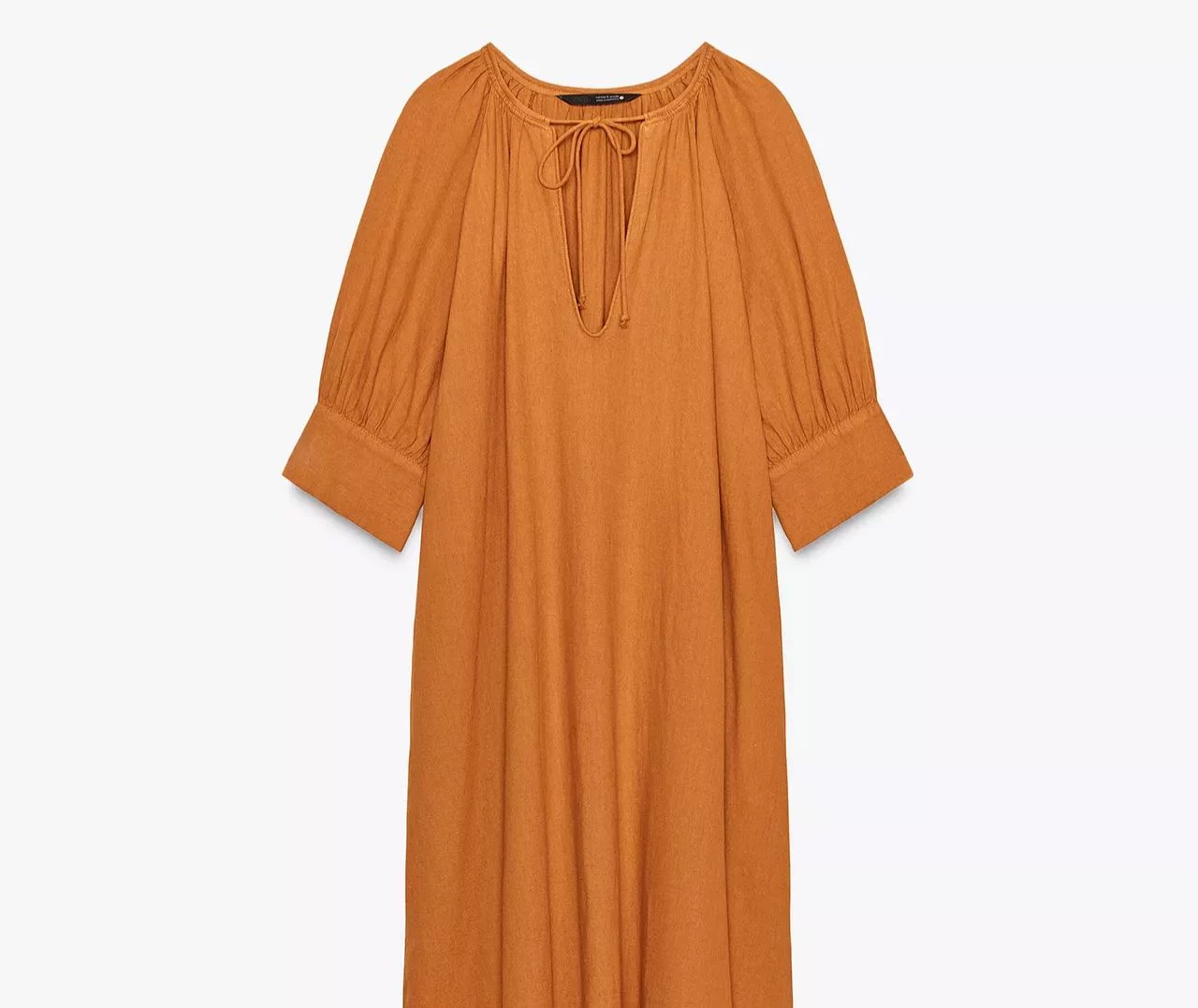 Por otro lado, si eres de las que no le gusta arriesgar tanto con los diseños y buscas un tono un poco más neutro pero con personalidad, el caftán color ‘toffee’ de Zara debe ser, sin duda, tu elección. Este vestido ha sido confeccionado en una mezcla de lino y viscosa, dos elementos clave para los días de más calor, que hacen que sea un gran aliado durante la temporada. El diseño incluye escote pico con lazadas, manga corta abullonada con puño y un bajo asimétrico con aberturas laterales que aporta dinamismo.