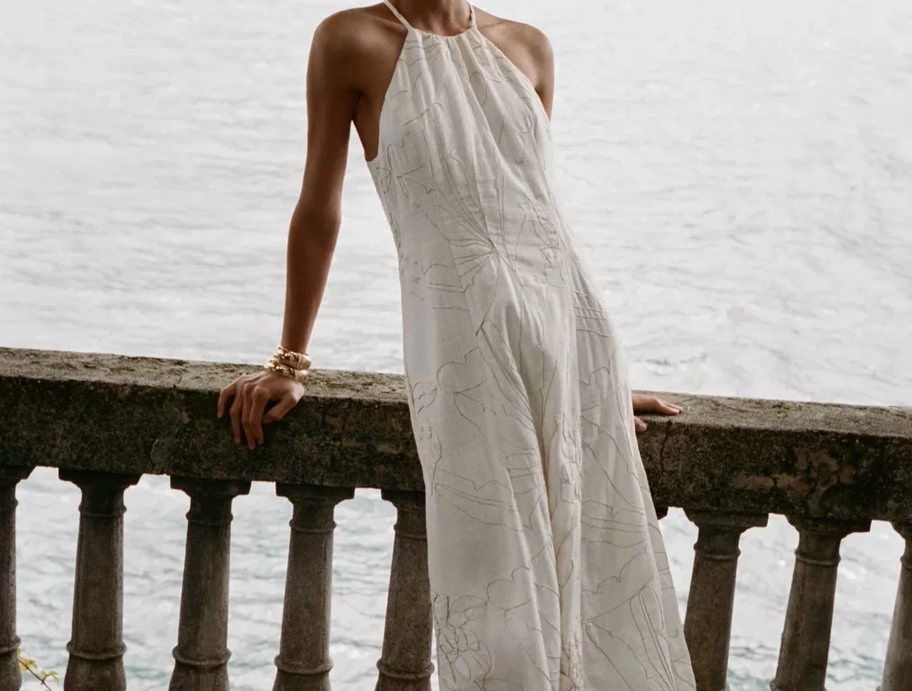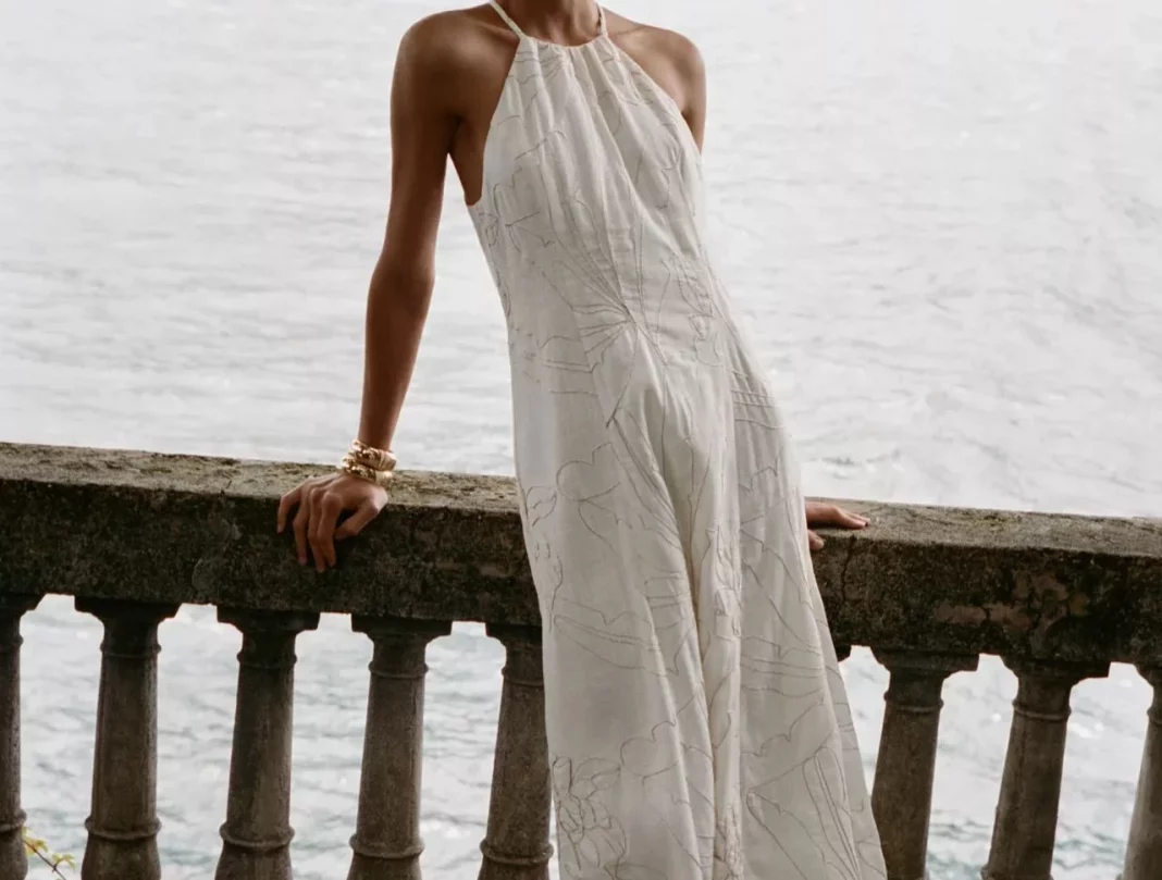 Vamos a empezar por una de las grandes joyas de la colección, que es, definitivamente, el vestido midi halter con bordado floral metalizado. Con este vestido de 49,95 euros, Zara consigue que un diseño clásico en color blanco se transforme en una prenda inolvidable gracias a su escote halter, que estiliza los hombros, y al trabajo de bordados, que aporta luz y distinción. Es la opción perfecta para una cita especial o incluso para usar en una boda de verano como invitada.