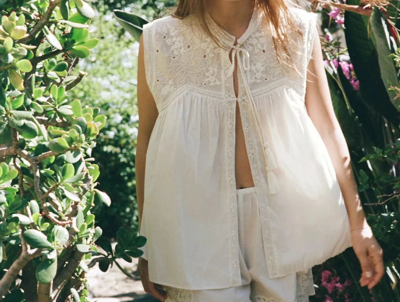 Continuamos esta lista con otro de los grandes aciertos de Zara esta temporada, que es su blusa con puntilla. Una prenda con bordados delicados y aplicaciones de abalorios, que consigue captar la esencia del estilo ibicenco a la perfección pero sin caer en lo predecible. La clave está en la sofisticación de sus acabados, que permiten combinarla tanto con bermudas informales como con faldas fluidas o pantalones elegantes.