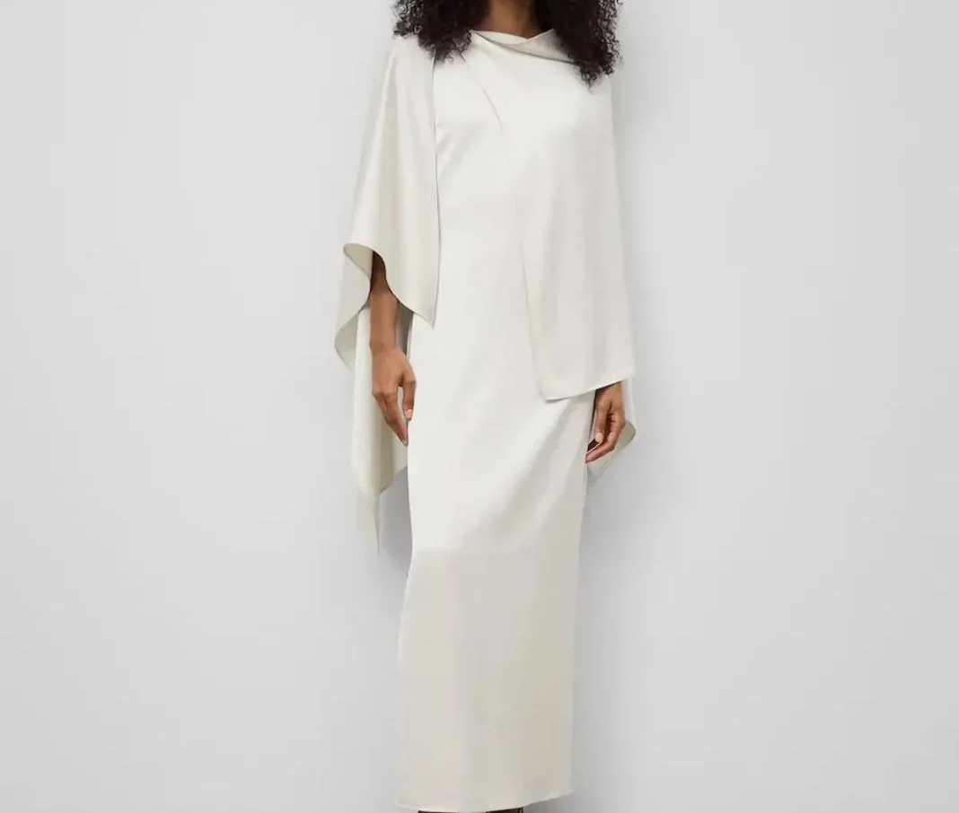 En el terreno de la moda de fiesta, El Corte Inglés también busca lucirse y propone este modelo de Adolfo Domínguez que evoca la elegancia silenciosa de los grandes eventos. Su chal asimétrico y su corte largo lo convierten en una prenda especial para ocasiones que exigen un dress code más cuidado, como galas, bautizos o cenas de empresa. El movimiento de la tela y la forma en que cae aportan una presencia imponente que tampoco cae en excesos.