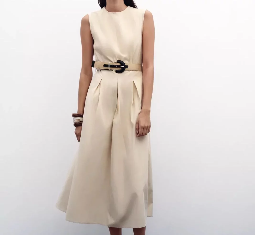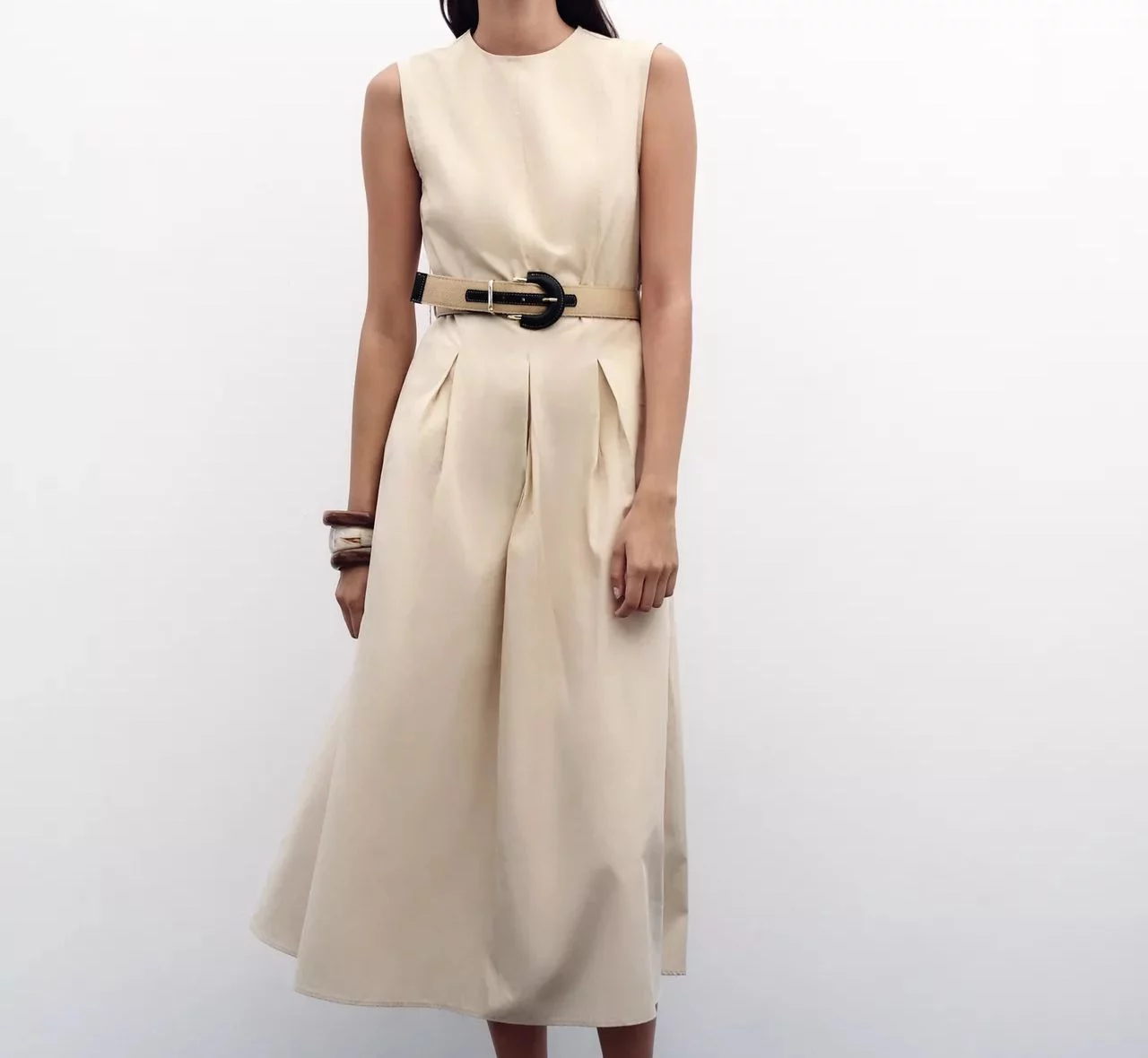 El vestido midi popelín con cinturón es la definición perfecta de elegancia veraniega. Con cuello redondo, manga sisa y una cintura entallada gracias a las pinzas y al cinturón, este diseño se convierte en un básico atemporal. Los bolsillos laterales ocultos y el bajo en evasé lo hacen aún más práctico, mientras que el cierre en la espalda con cremallera aporta un acabado pulido y discreto. Disponible en color arena, es de esos vestidos que funcionan tanto de día como de noche.