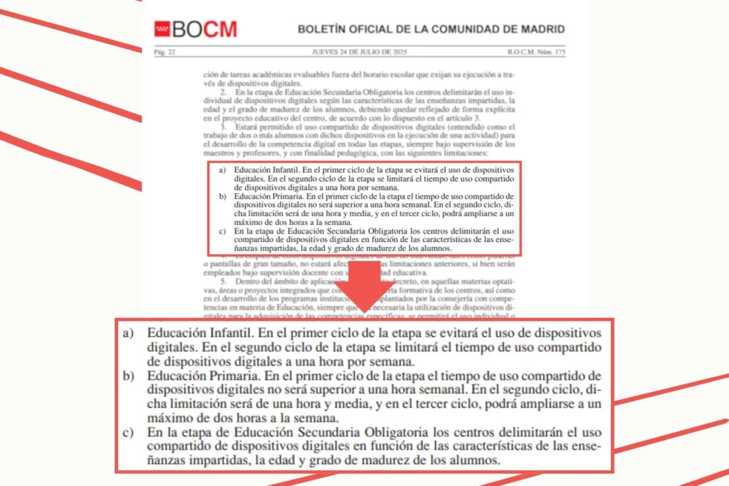 El debate que ha generado esta revelación, nos hace cuestionar si en España funcionaría una medida similar; esto en vista de que no existe una ley estatal que regule el uso de dispositivos tecnológicos en los colegios del país. Sin embargo, la Comunidad de Madrid ha decidido dar el primer paso en esta materia, por lo que también conocerás el Decreto que entrará en vigor este período académico 2025-2026.