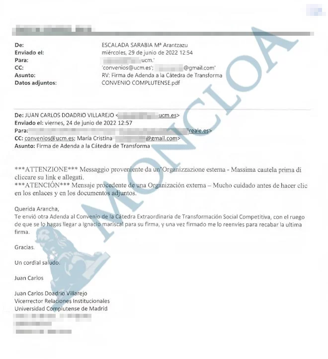 El juez también constata la existencia de «un email dirigido a la Directora de comunicación institucional de Reale Seguros, solicitando directamente la continuidad como entidad patrocinadora del máster, lo que parece exceder claramente sus funciones».