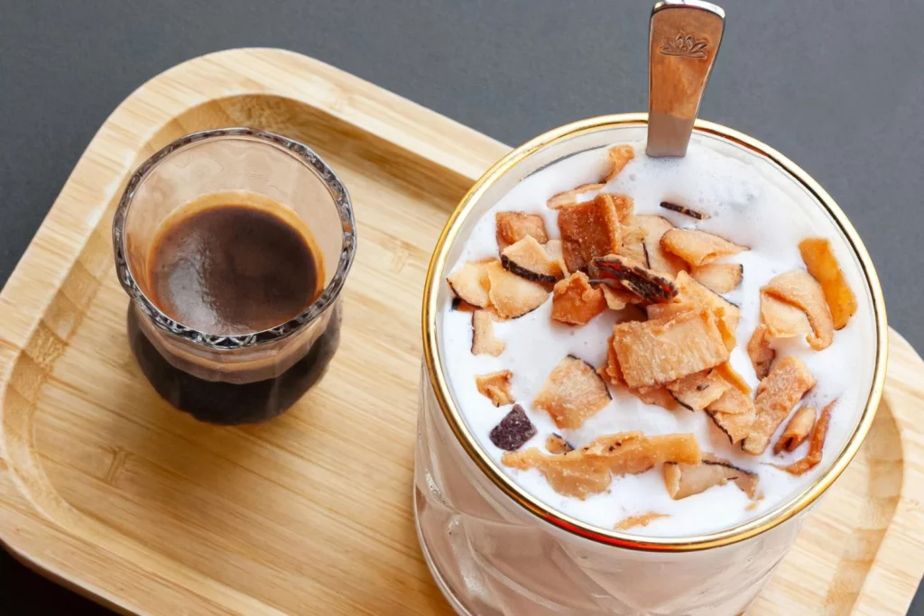 Para conseguir estas ventajas, puedes conseguir las grasas saludables en la MCT del aceite de coco. Con una cucharadita o 5 ml aproximadamente de aceite de coco en esta bebida, permite combatir de forma natural los niveles altos del colesterol malo. Mientras si agregas una tapita de proteína en polvo (preferiblemente de sabor a cacao o vainilla para no alterar el sabor) mezcla vigorosamente hasta que emulsione, te debe quedar espumoso como un café con leche tradicional.