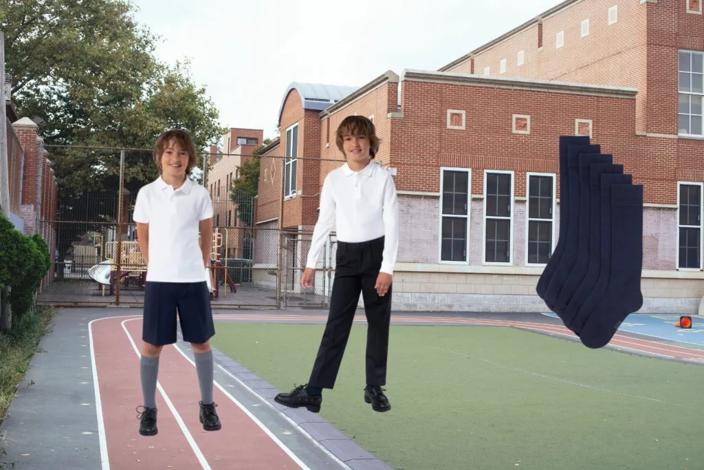 Por su parte la falda de tablas para uniforme por 9,99 euros también entra en el bazar de ofertas de lleva tres y paga dos. Viene en los colores azul marino y gris oscuro, disponible para tallas de 4 a 18 años. Le sigue el paquete de tres calcetines altos para uniforme unisex desde la talla 24 a la 41 por 4,99 euros. Esta maravilla viene disponible en los colores azul marino, gris oscuro y burdeos. Sigue, leyendo y descubre la moda escolar para niños que también la puedes encontrar en la oferta de 3×2.