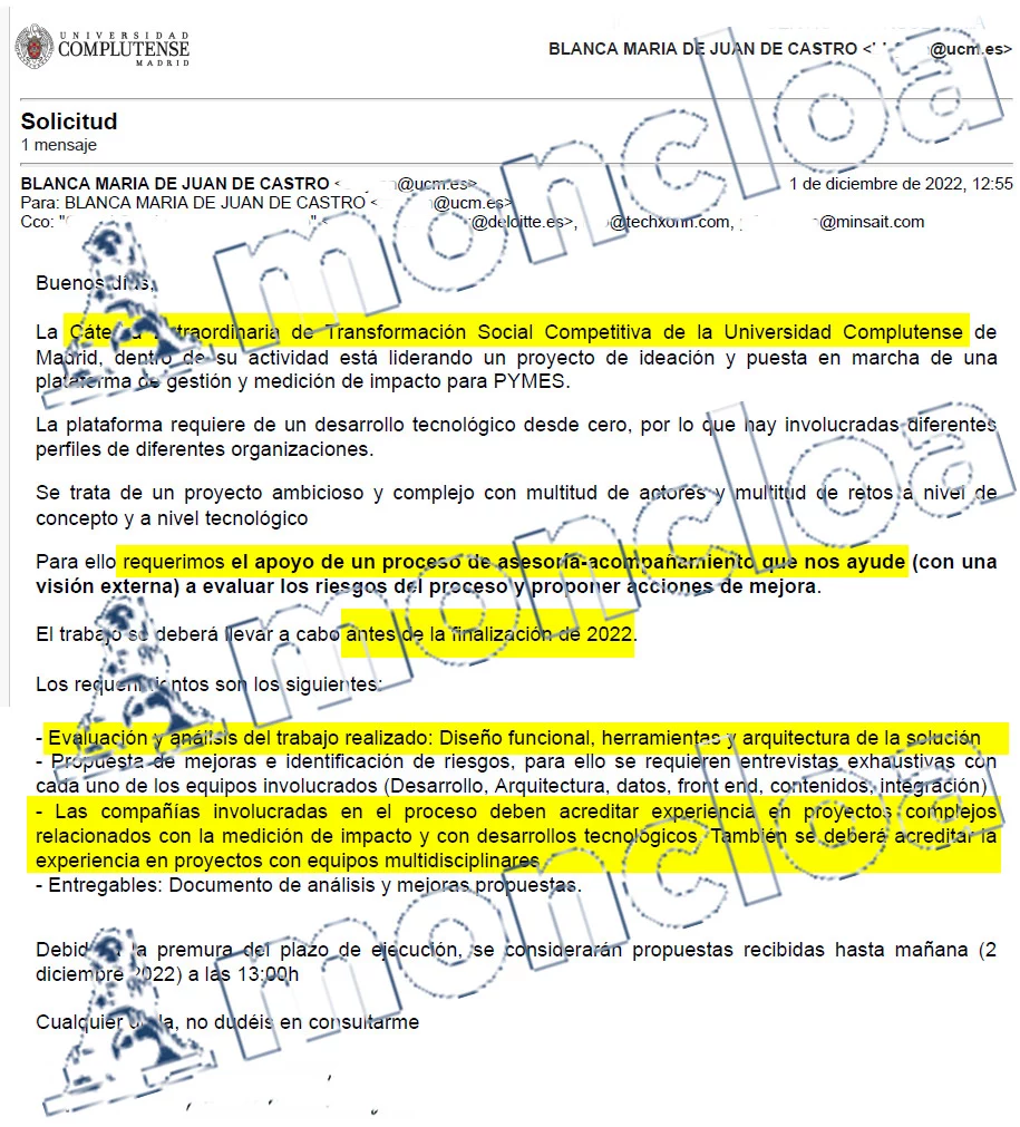 Dos días después, el 1 de diciembre de 2022 Blanca de Juan mandaría el mismo mail a tres direcciones diferentes que copiaba «literalmente» el documento de la memoria de necesidades firmado por Begoña Gómez y sólo fue contestado por Deloitte.