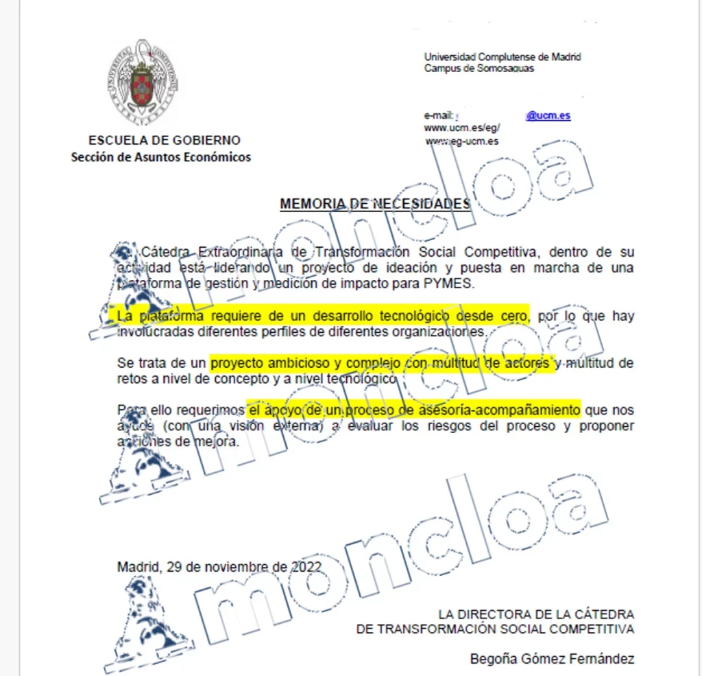 El proceso lo había iniciado la propia Begoña Gómez el 29 de noviembre de 2022 al establecer en un folio la «memoria de necesidades» de la Cátedra: «La plataforma requiere de un desarrollo tecnológico desde cero, por lo que hay involucradas diferentes perfiles de diferentes organizaciones» y añadía que «se trata de un proyecto ambicioso y complejo con multitud de actores y multitud de retos a nivel de concepto y a nivel tecnológico».