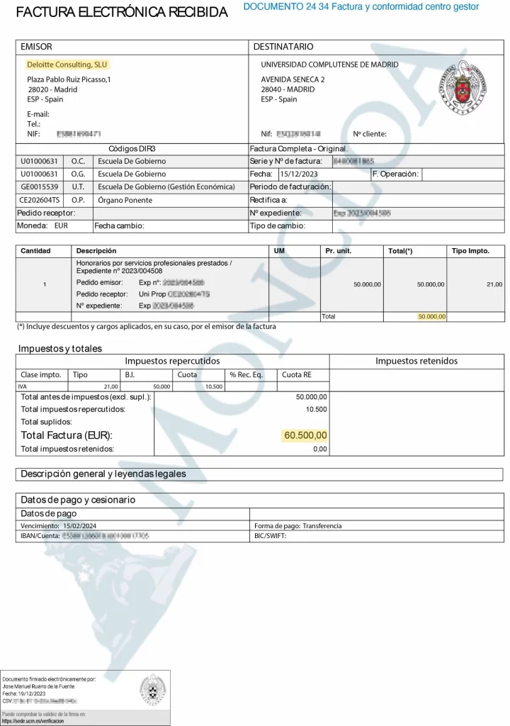 Sólo se presentó uno, Deloitte, que evidentemente se adjudicó el contrato por 18.148,79 euros, pagados el 9 de marzo de 2023, curiosamente el mismo día que se firmó el Informe del Órgano de Contratación de la UCM, necesario para justificar la contratación, cuatro meses después.