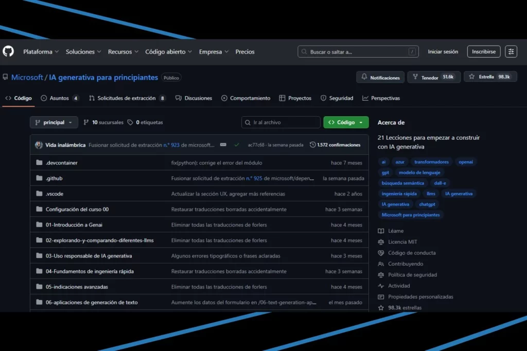 Una vez terminada la introducción puedes acceder a la plataforma de GitHub, donde encontrarás una amplia colección de carpetas que contienen cerca de 900 archivos que te guiarán por el extenso camino hacia el uso eficiente de los diferentes modelos de inteligencia artificial. Los requisitos no son muchos, solo necesitas un correo y registrarte en la plataforma para poder acceder, incluso yo he investigado y he entrado a todos los módulos sin registrarme.