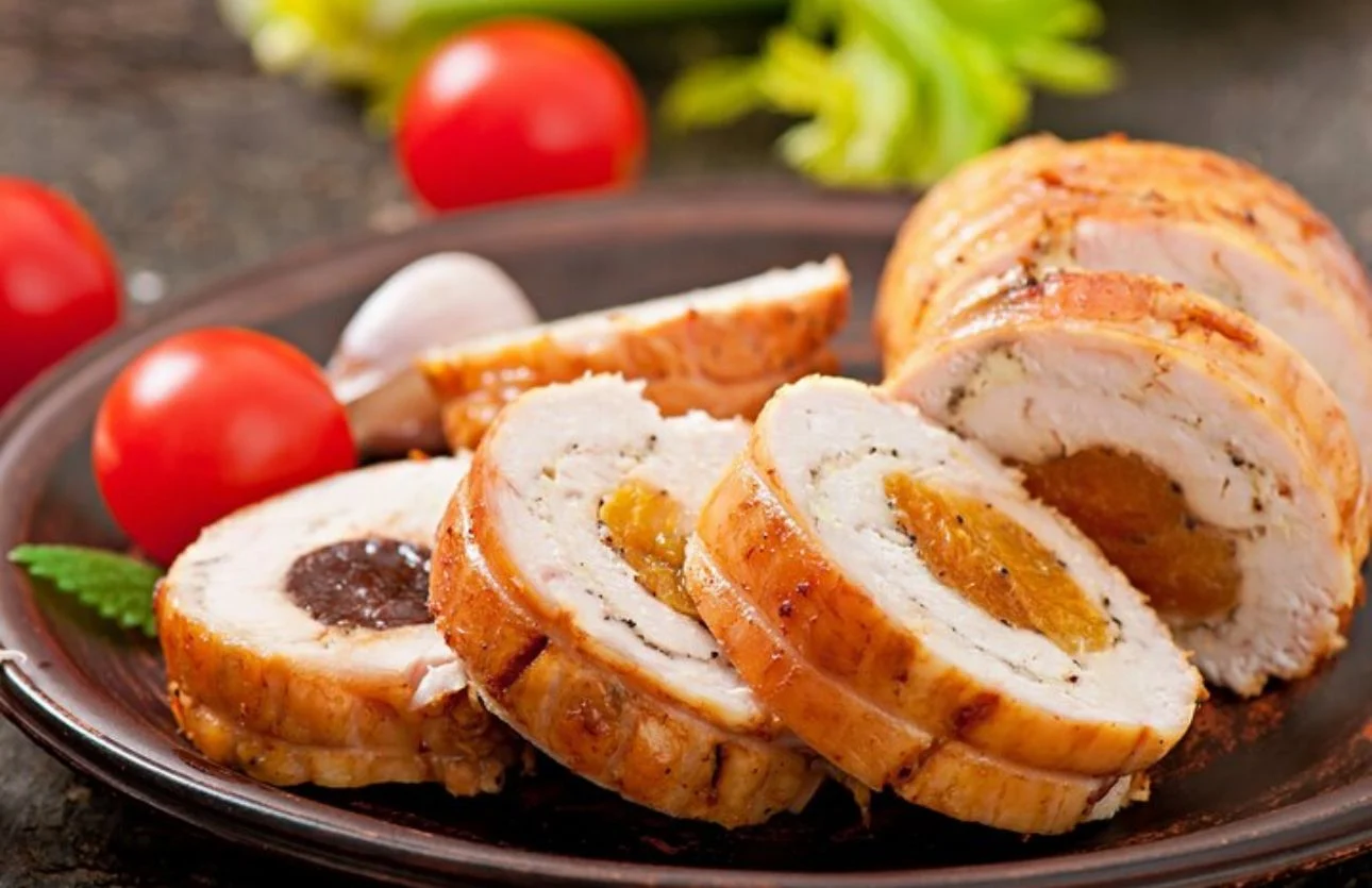 Cuando el enrollado de pollo esté listo, es importante que lo dejes reposar unos minutos antes de cortarlo, porque así los jugos se asientan y las rodajas quedan limpias y firmes. Después llega la hora de servirlo y es recomendable hacerlo en un plato amplio, dejando que el brillo del jamón y el aroma del relleno hablen por sí solos, porque este es uno de esos platos que no necesitan demasiada decoración para destacar.
